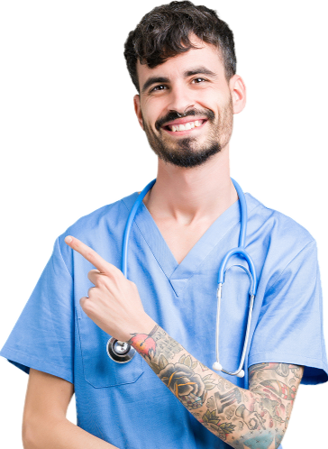 Doctor in blue scrubs with stethoscope, pointing with confidence — symbolising access to trusted resources and clinical empowerment.